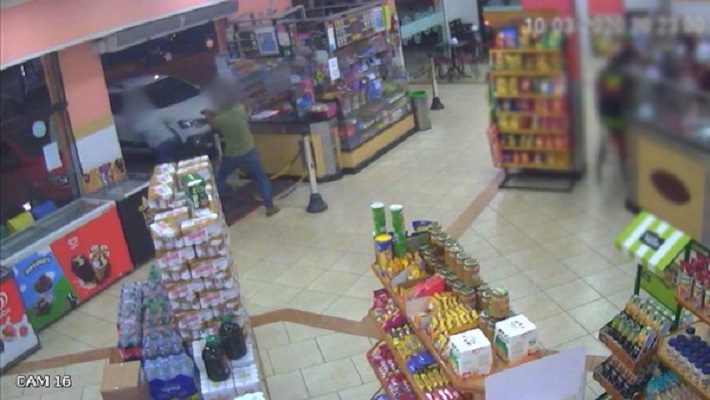 Nas imagens é possível ver que o homem entra no comércio e em seguida o criminoso chega. Ele rouba a carteira e a corrente do cliente e em seguida vai até o caixa, mas acaba derrubando algo no chão e se abaixa para pegar. Em seguida o cliente, que é um atirador esportivo, saca uma arma e reage ao assalto, atingindo o homem.