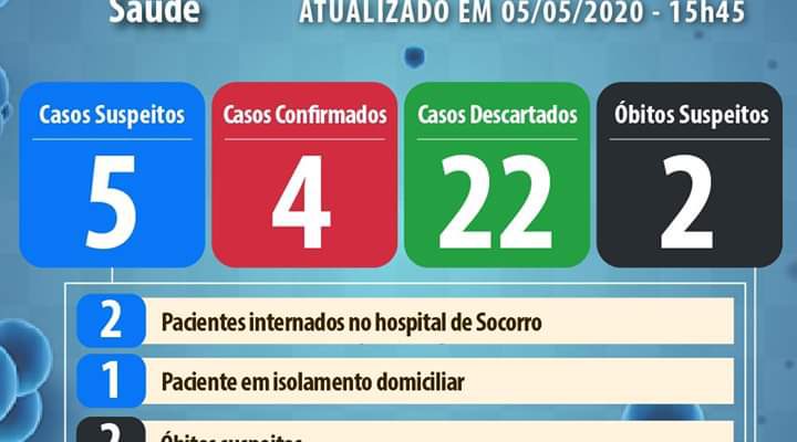 O Município agora contabiliza 4 casos confirmados, 22 descartados e 5 suspeitos, sendo eles um homem de 85 anos que se encontra internado no Hospital Doutor Renato Silva, com o quadro estável; o óbito de um homem de 76 anos e de um jovem de 21; uma mulher, de 30 anos, que cumpre isolamento domiciliar e uma mulher de 83 anos que está internada na UTI de Socorro.