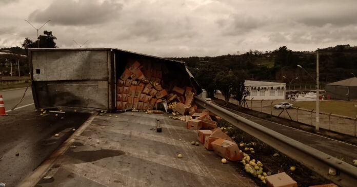 Na manhã desta segunda-feira (11), um caminhão baú carregado com 12 toneladas de maracujá tombou na Rodovia Fernão Dias em Atibaia. De acordo com informações da Polícia Rodoviária Federal, o caminhão seguia pela pista sentido sul quando por volta da 7h30, o motorista percebeu que o veículo apresentava problemas e se manteve na faixa da direita.