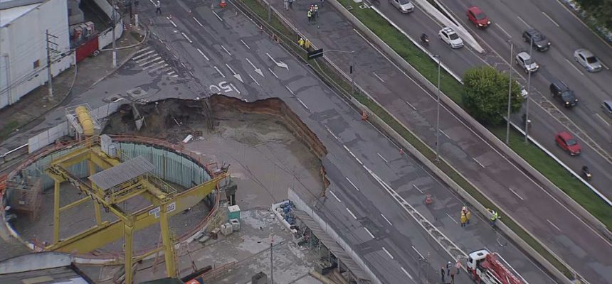 A cratera aberta na Marginal Tietê, na Zona Oeste de São Paulo, nesta terça-feira (1º), aumentou de tamanho e já afetou três das quatro faixas da pista local. O desabamento ao lado das obras da Linha 6-Laranja do Metrô ocorreu por volta das 9h da manhã.