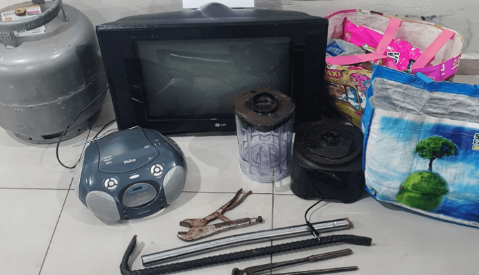 Em vistoria ao veículo, os policiais encontraram televisão, rádio portátil, liquidificador, processador de alimentos, mantimentos, botijão de gás e algumas ferramentas. Questionados sobre os objetos, o motorista de 28 anos e seu acompanhante de 21 anos, confessaram terem acabado de roubar uma chácara no bairro Atibaianos. Os policiais foram até o local e constataram que eles arrombaram uma janela e reviraram todo o imóvel.