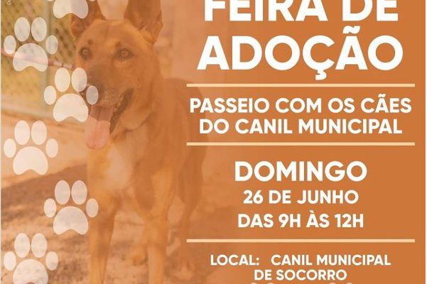 No dia 26 de junho, a Secretaria de Meio Ambiente e Desenvolvimento Sustentável de Socorro realizará uma Feira de Adoção dos Cachorros do Canil da cidade e um passeio com os animais.