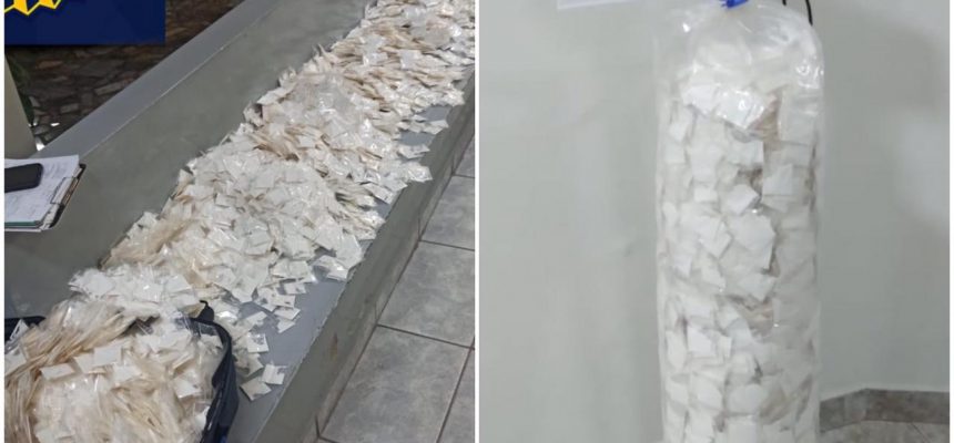 No total, foram apreendidos 9,876 papelotes de cocaína, com o peso total de 9,100kg, dois celulares, uma mala, uma mochila, uma passagem de ônibus e um Escort vermelho.