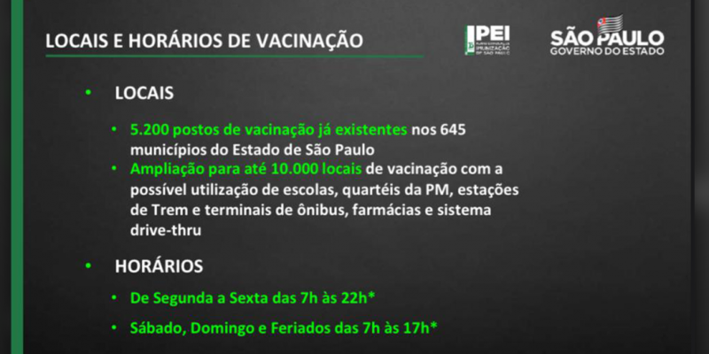 O Governador João Doria apresentou durante o 1º Seminário Virtual de Gestão Pública, na última semana, o Plano Estadual de Imunização contra o coronavírus aos 645 prefeitos eleitos para os mandatos iniciados em 2021. A estratégia das autoridades estaduais é iniciar a imunização contra a COVID-19 em todas as regiões do estado no dia 25 de janeiro.