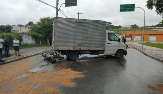 Segundo informações do boletim de ocorrência (BO), uma moto, um caminhão e um ônibus se envolveram em um acidente de trânsito na Rua Aquiles Bianchi, por volta de 14h30 de domingo.