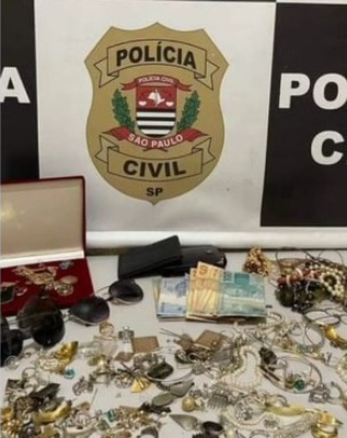 Ato contínuo, chegou ao conhecimento da equipe do SIG que o autor do roubo e mais um indivíduo haviam saído da residência rumo à uma pousada da cidade. E deslocando-se até o local, os policias civis encontram no interior do estabelecimento os produtos do roubo, sendo recuperados o valor de R$ 516,00; 20 joias de ouro; 3 óculos e diversas bijuterias.
