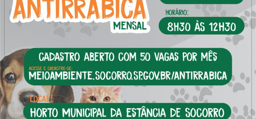A Secretaria de Meio Ambiente e Desenvolvimento Sustentável da Prefeitura de Socorro abriu cadastro para vacinação antirrábica gratuita de cães e gatos. A vacinação, realizada em conjunto com a Vigilância em Saúde, vai acontecer a cada quinze dias, com cinquenta vagas.