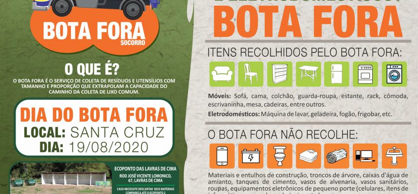 O Dia do Bota Fora tem como objetivo dar o destino correto para diferentes materiais inservíveis, contribuindo com o meio ambiente evitando o descarte irregular. Caso necessite descartar seus materiais, compareça ao ECOPONTO 2, localizado na Rodovia José Vicente Lomonico,67, Lavras  de Cima.