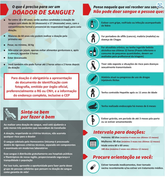 No sábado, dia 23 de julho, a partir das 9h, o Centro Educacional Horizonte será sede de mais uma campanha de doação de sangue realizada pelo Hemocentro da Unicamp. Para doar, basta comparecer ao local, portando documento de identificação com foto, e preencher os requisitos básicos como: evitar o consumo de álcool nas 12 horas que antecedem a doação e não ter apresentado sintomas de gripe ou resfriado ao longo de 15 dias antes da coleta.