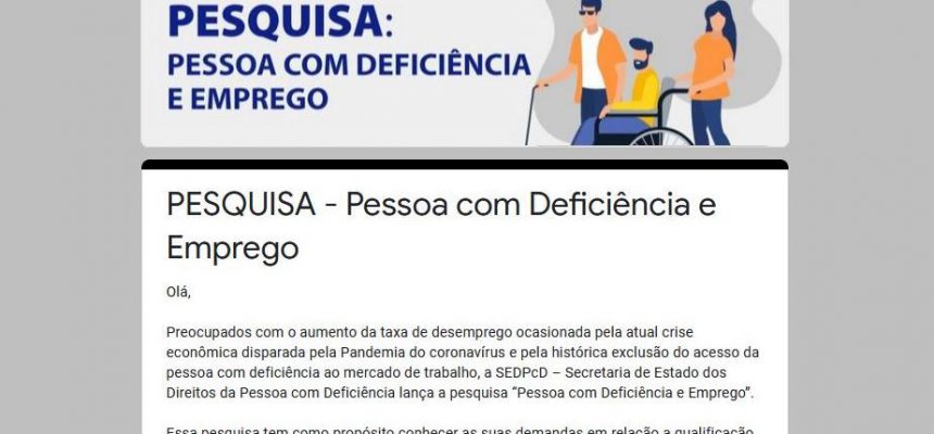 Em dezembro de 2020, a Secretaria de Estado dos Direitos da Pessoa com Deficiência lançou a pesquisa “Pessoa com Deficiência e Emprego”. A ação tem como objetivo traçar novas estratégias e implementar ações que potencializem o processo da inclusão profissional das pessoas com deficiência.
