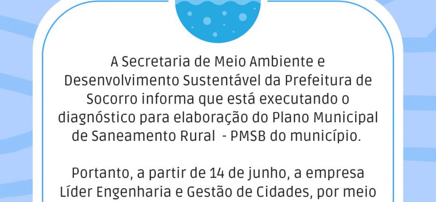 Na última terça-feira, 13 de junho, a Secretaria de Meio Ambiente e Desenvolvimento Sustentável da Prefeitura Municipal de Socorro emitiu um comunicado anunciando o início do processo de levantamento de informações para a elaboração do Plano Municipal de Saneamento Rural.