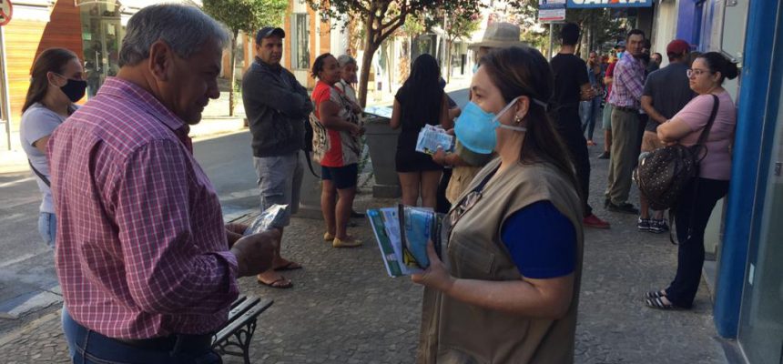 A Secretaria Municipal de Saúde de Socorro realizou, na manhã de segunda-feira, 13, uma ação educativa entregando máscaras nas filas formadas em frente a bancos e lotéricas do centro da cidade.