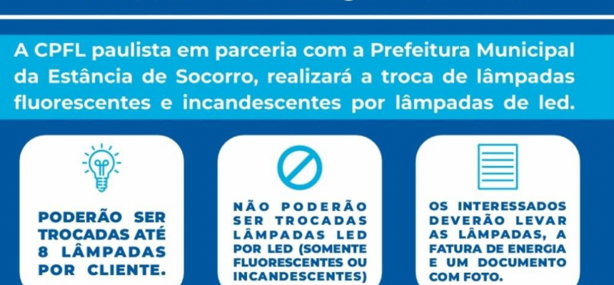 Entre os dias 27, 28 e 29 de agosto, os moradores de Socorro poderão participar da campanha de substituição de lâmpadas, trocando até 8 unidades incandescentes ou fluorescentes por novas lâmpadas de LED.