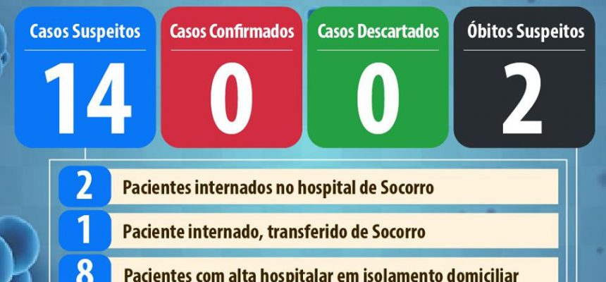 Socorro contabiliza um total de 14 casos suspeitos de pessoas infectadas pelo novo coronavírus. Além dos três novos casos, 8 pacientes já receberam alta hospitalar e cumprem isolamento domiciliar e um já não mais apresenta sintomas. Há também duas mortes suspeitas aguardando o resultado do exame. A cidade não tem casos confirmados ou descartados.